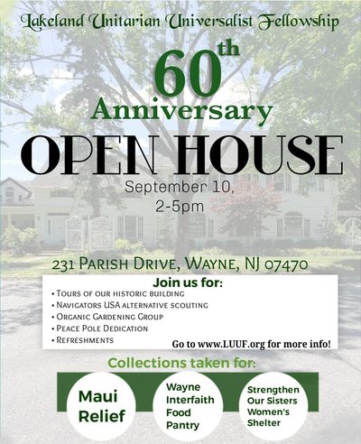 We will have exhibits with information about the above groups, as well as NJ Peace Action, UU Faith Action NJ, Unitarian Universalism, the history of LUUF, and the history of our building.