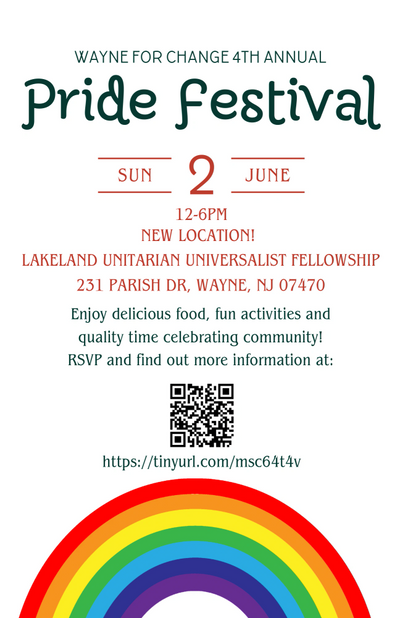 Welcome to the Wayne For Change Pride Festival! Join us at the Lakeland Unitarian Fellowship for a day filled with love, acceptance, and celebration. This in-person event is your chance to come together with the community and show your support for equality and diversity. Get ready for live music, delicious food, fun activities, and more! Let's come together to spread positivity and make a difference. Don't miss out on this incredible opportunity to stand up for what you believe in. See you there!